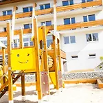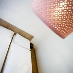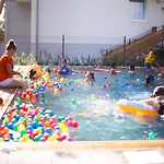 Nogle af værelserne har udsigt over swimmingpool. Der er et badekar og en bruser.